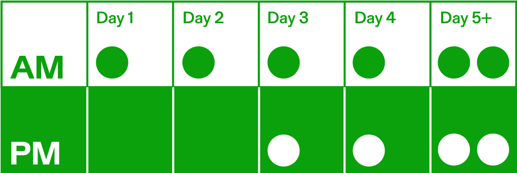 - Day 5+: Take two capsules twice daily, one hour before meals.